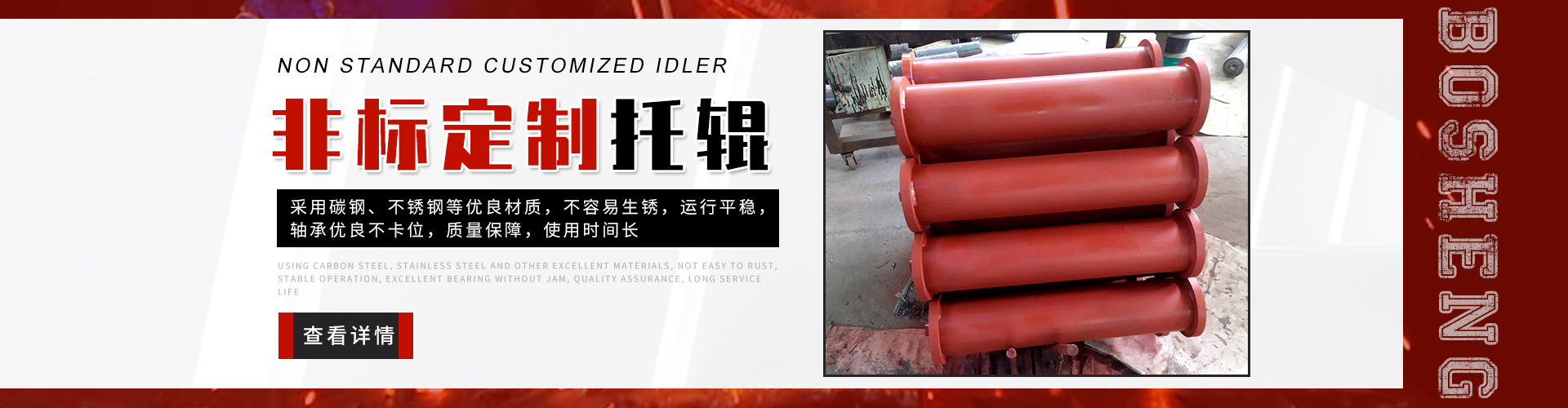 泰安博晟礦山機(jī)械有限公司位于山東泰安新泰市汶南鎮(zhèn)陳糧村。緊鄰京滬、京福、萊新高速公路。公路交通極為方便,環(huán)境優(yōu)美。公司主要生產(chǎn):托輥、托輥配件、托輥支架等皮帶輸送機(jī)配件。歡迎各界商友前來(lái)洽談考察。聯(lián)系電話(huà):13954880316.   泰安博晟礦山機(jī)械有限公司采用國(guó)際標(biāo)準(zhǔn)設(shè)計(jì)、制造技術(shù),將托輥的設(shè)計(jì)和制造提高到了一個(gè)更高的水平,生產(chǎn)的托輥具有小的旋轉(zhuǎn)阻力,長(zhǎng)的壽命,小的維修工作量和高的承載能力。鋼管采用托輥專(zhuān)用高頻焊管,管內(nèi)做去刺處理,圓度控制在特殊的公差范圍之內(nèi)。軸是按標(biāo)準(zhǔn)公差加工的冷拉鋼制造。軸承座采用進(jìn)口冷扎鋼板經(jīng)多次工藝沖壓而成。托輥管和軸承座被自動(dòng)焊接機(jī)械手焊接在一起,形成一個(gè)具有很高強(qiáng)度的整體構(gòu)造。托輥軸承采用國(guó)內(nèi)外知名品牌的大游隙深溝球雙密封軸承,使托輥具有理想的靜平衡和動(dòng)平衡,其旋轉(zhuǎn)阻力優(yōu)于國(guó)標(biāo)。托輥密封采用綜合國(guó)外和國(guó)內(nèi)迷宮式密封的特點(diǎn)進(jìn)行了專(zhuān)門(mén)設(shè)計(jì),內(nèi)充耐高速高溫和超低溫抗氧化鋰基酯,有效防止雜質(zhì)、水、空氣對(duì)托輥內(nèi)部的侵蝕。   目前我們托輥系列產(chǎn)品有槽形上調(diào)心托輥組、槽形托輥、槽形下調(diào)心托輥組、承載托輥、緩沖托輥、回程托輥組、螺旋托輥、摩擦上調(diào)心托輥組、平行緩沖托輥組、平行上調(diào)心托輥、礦用托輥、煤礦專(zhuān)用托輥、梳型托輥、樹(shù)脂托輥、陶瓷托輥、橡膠托輥、錐形托輥、立輥等。規(guī)格:直徑50-219mm;長(zhǎng)度190-2600mm。   泰安博晟礦山機(jī)械有限公司竭誠(chéng)愿與廣大客戶(hù)合作,共同發(fā)展開(kāi)發(fā)新技術(shù)新項(xiàng)目。泰安博晟礦山機(jī)械有限公司秉承